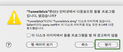 2 "Tunnelblick은 인터넷에서 다운로드된 응용 프로그램 입니다. 열겠습니까?"라는 메세지가 나오면 "열기"를 클릭합니다.