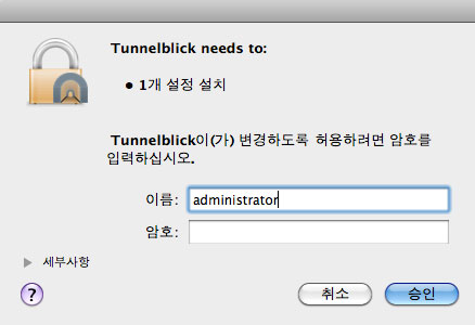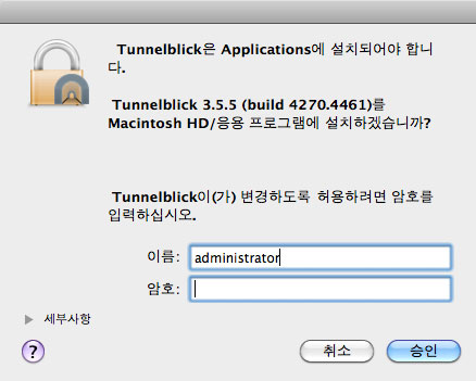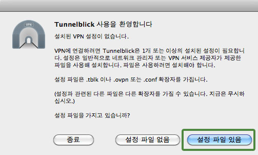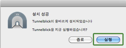 MAC OS X에서 OpenVPN 접속은 "Tunnelblick"이라는 프로그램을 사용하며, MAC OS X 10.4.11 버전 이상에서 사용이 가능합니다. 프로그램 설치를 위해서는 Admin 계정이 필요합니다.