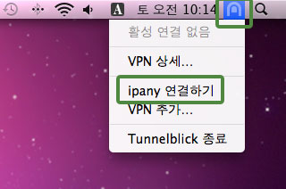 1 그림과 같이 메뉴 메뉴 막대의 Tunnelblick 아이콘을 클릭하고 "회사명 연결하기"을 선택합니다.