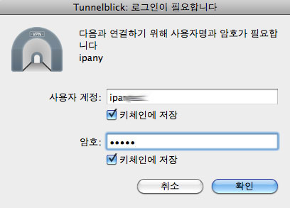 2 로그인 창이 열리면 회사 관리자에게서 받은 아이디와 비밀번호를 입력하고 "확인" 버튼을 클릭하면 접속됩니다. "키체인에 저장"를 선택하면 다음에 로그인 없이 바로 접속이 가능합니다.
