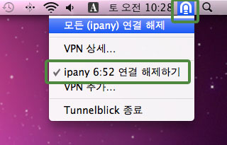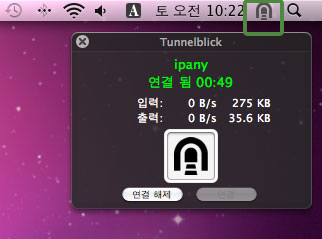 메뉴 막대의 Tunnelblick 아이콘에 마우스를 올리면 나타나는 상태 창에서 "연결 해제"를 선택하거나, Tunnelblick 아이콘을 클릭하고 "연결 해제"를 선택하면 접속이 끊어집니다.