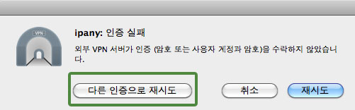 만약 "키체인에 저장"을 선택하고 아이디나 비밀번호를 잘못 입력하여 접속에 실패했다면, 인증 실패 창에서 "다른 인증으로 재시도"를 선택하여 아이디나 비밀번호를 변경하여 접속할 수 있습니다.