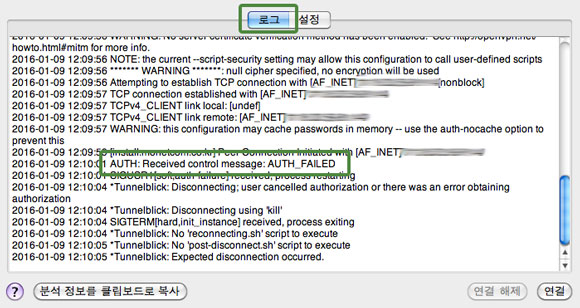 | AUTH: Received control message: AUTH_FAILED | Username 이나 Password를 잘못 입력한 경우입니다. 아이디와 비밀번호를 다시 확인합니다. |