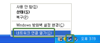 1 네트워크 연결 트래이 아이콘에 마우스 포인터를 올리고 "마우스 오른쪽 버튼"을 클릭한 후 "네트워크 연결 열기"를 선택합니다.