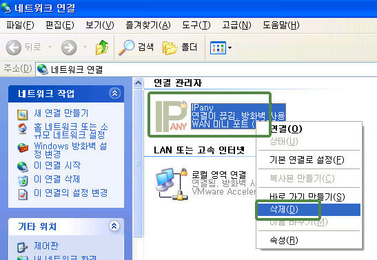 2 "연결 관리자" 아래 "IPany"에 마우스 포인터를 올리고 "마우스 오른쪽 버튼"을 클릭한 후 "삭제"를 선택합니다.